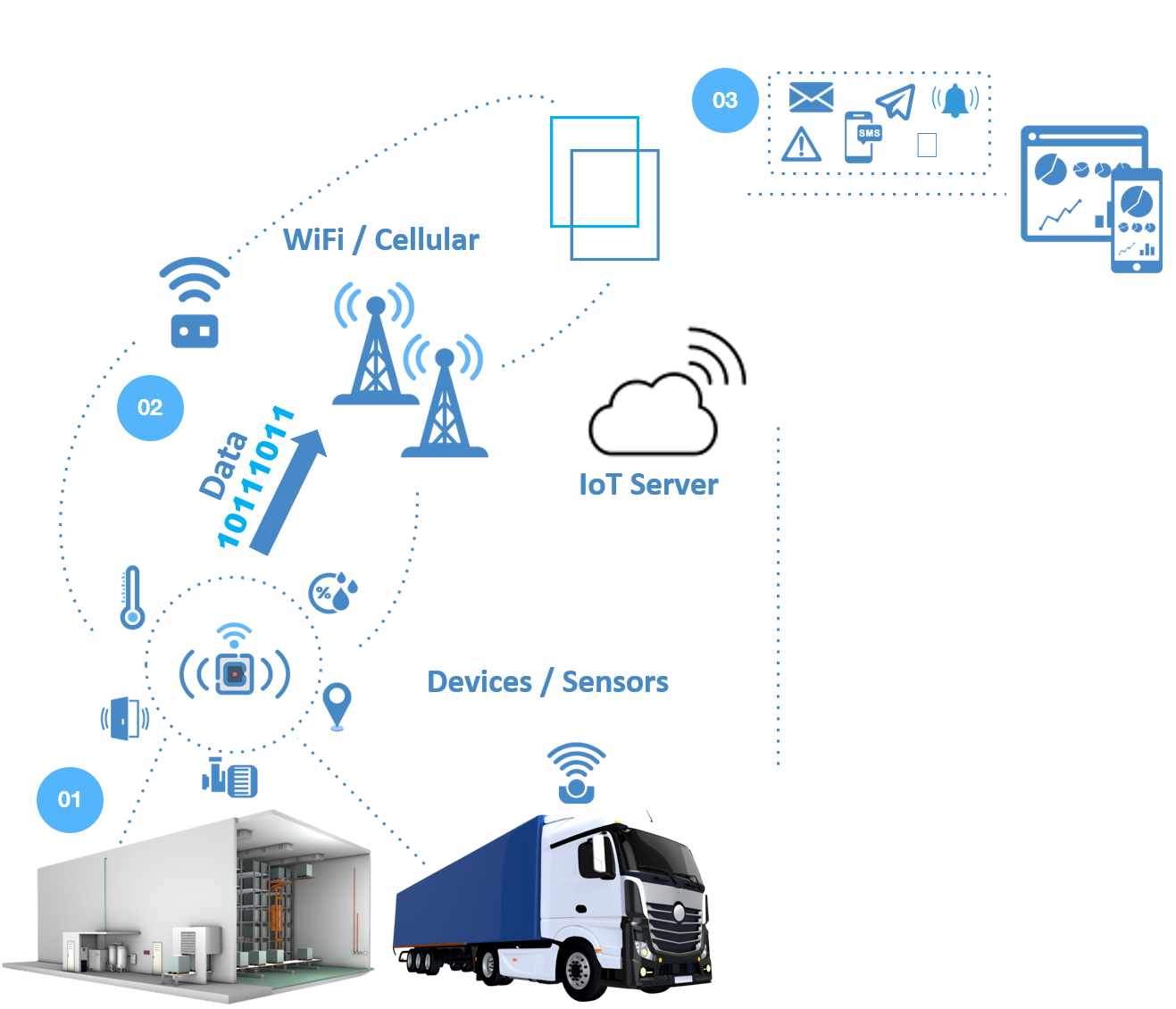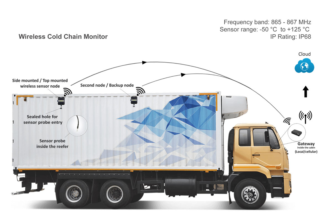 Sensors (Temperature, Humidity, Door Status, Location & Vibration) collects data from the Cold Rooms & Refrigerated Trucks