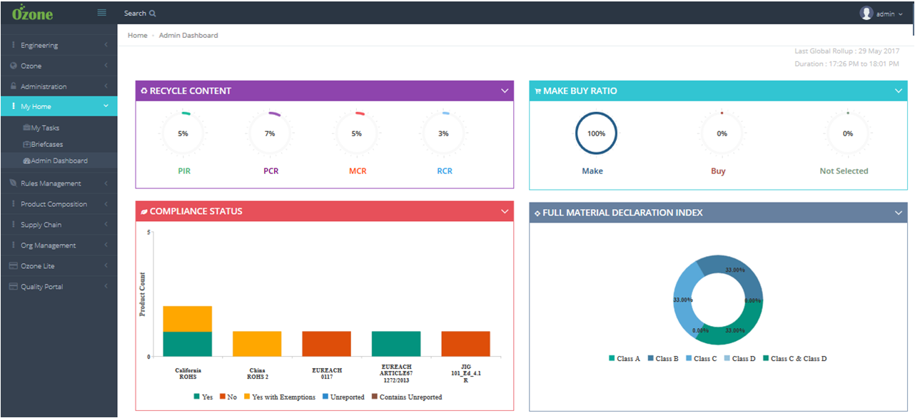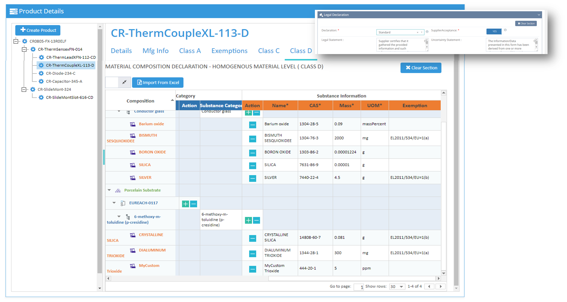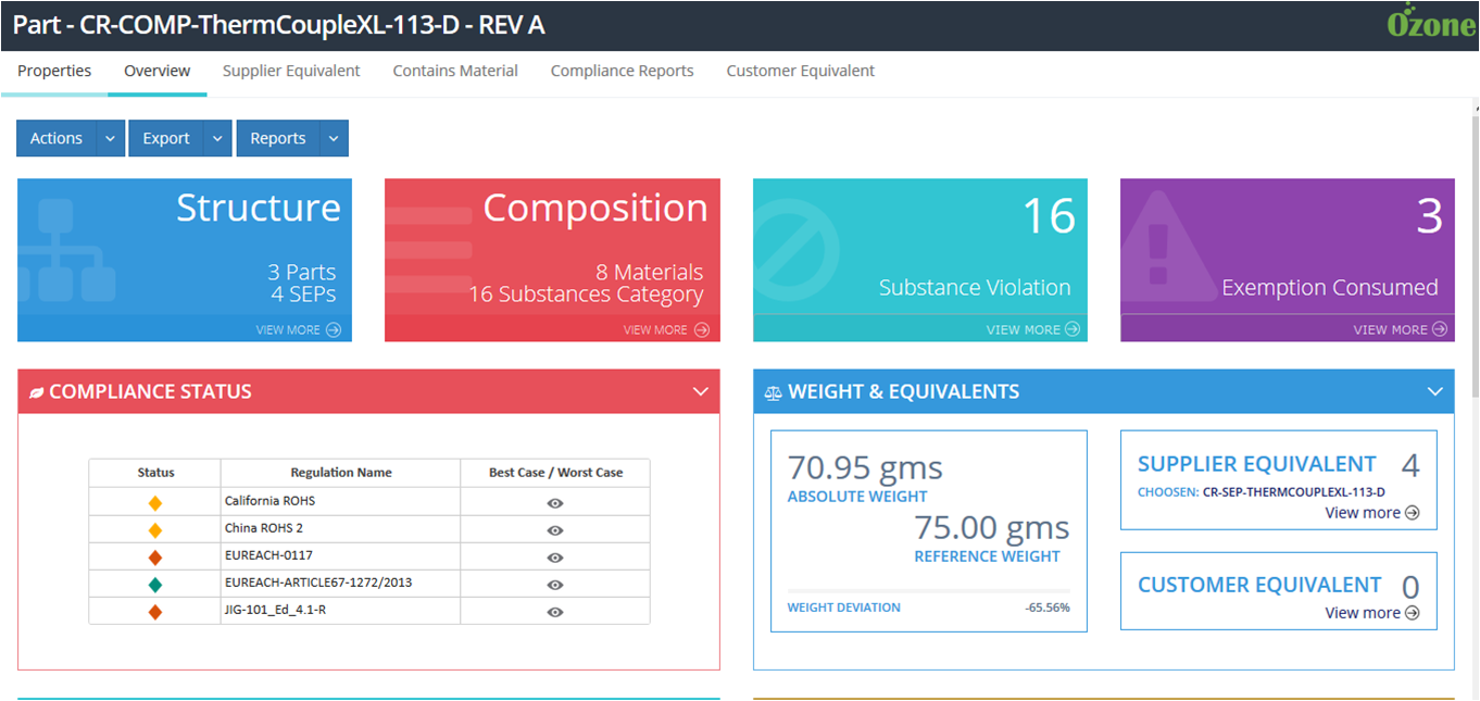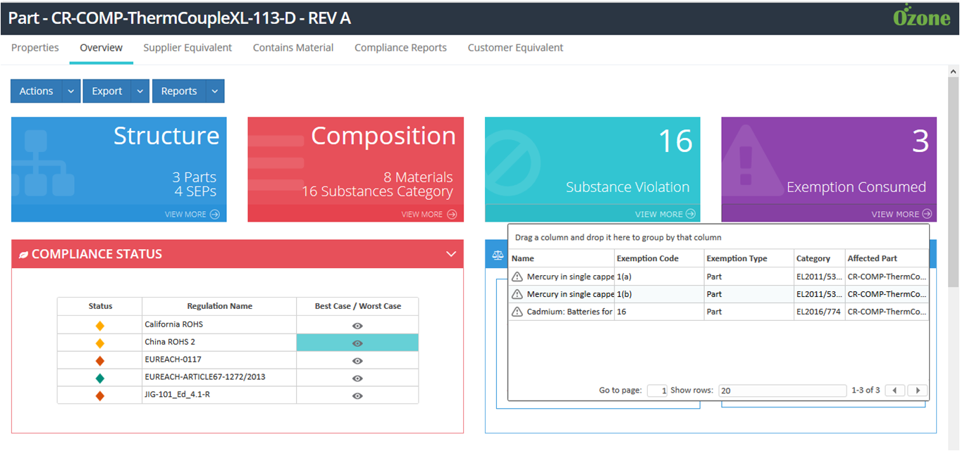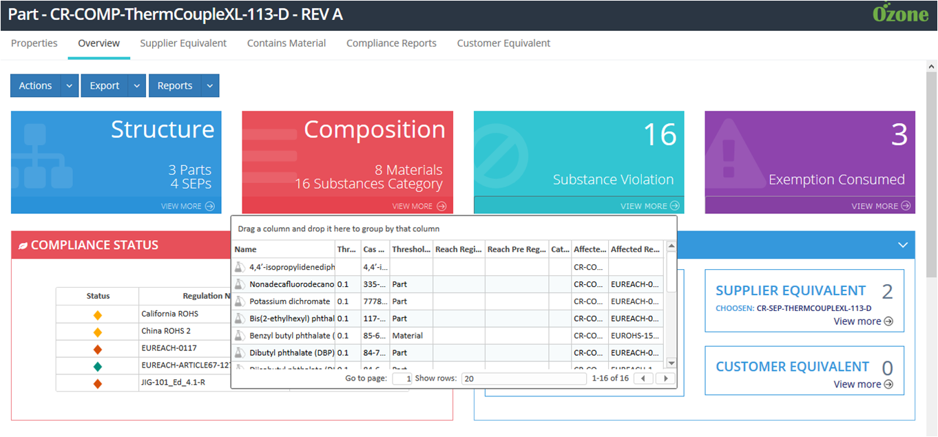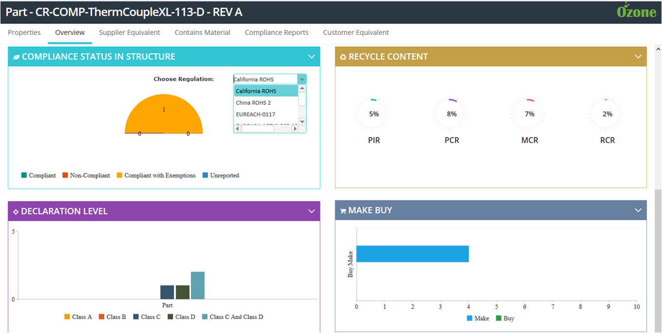 Product Structures and BoM with embedded materials and substance structure for a comprehensive view of the product composition. This is validated against active regulations providing a detailed audit trail of the compliance index at all levels of the product structure. Explore weights, costs, alternatives, substances of concern (SOC), country of origin, conflict minerals, reuse and recyclability with Ozone.