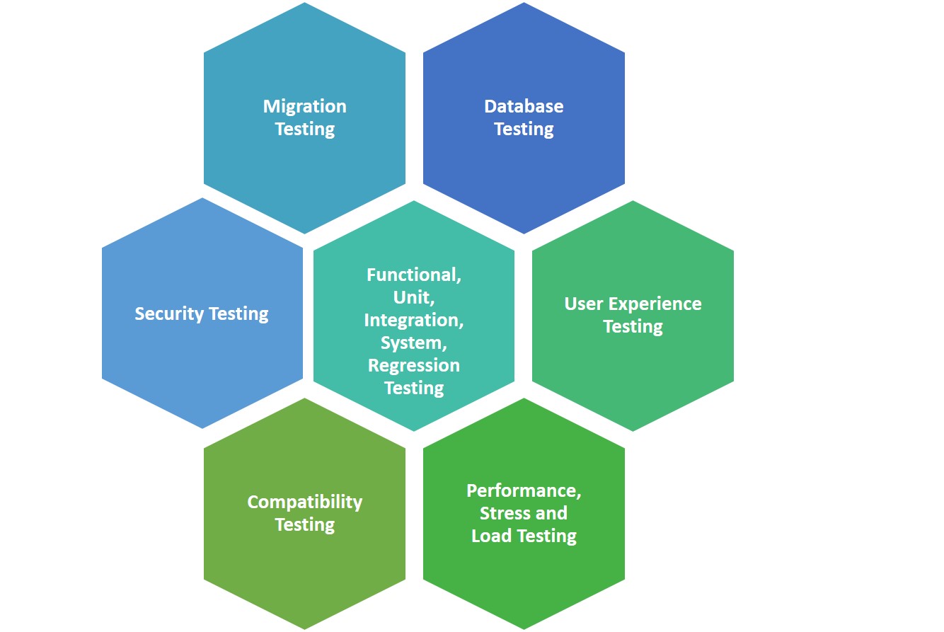 Functional, Unit, Integration, Integrated, System, Regression Testing.